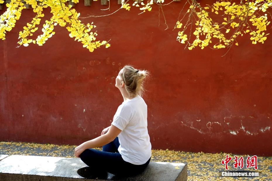 11月7日,河南登封嵩山少林寺内,千年古银杏树一片金黄,吸引民众流连忘返。其中天王殿前最大的一棵古银杏树苍劲挺拔,已有1500多年历史,它高25米,冠幅达37米。图为一名外国姑娘在银杏树下打坐感受禅意。 王中举 摄