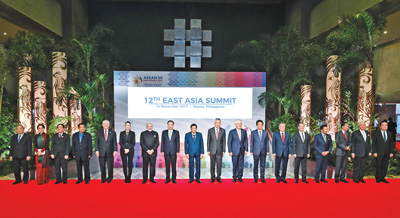 11月14日,国务院总理李克强在菲律宾国际会议中心出席第十二届东亚峰会。这是会议前,李克强同出席会议的东盟十国领导人以及韩国总统文在寅、俄罗斯总理梅德韦杰夫、日本首相安倍晋三、印度总理莫迪、澳大利亚总理特恩布尔、新西兰总理阿德恩、美国国务卿蒂勒森合影。新华社记者 庞兴雷摄