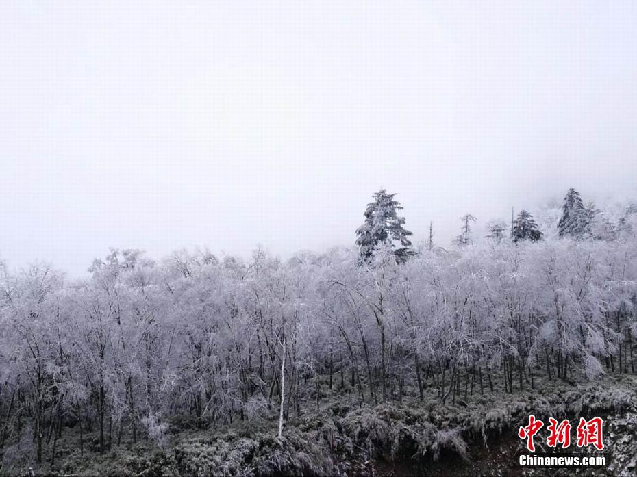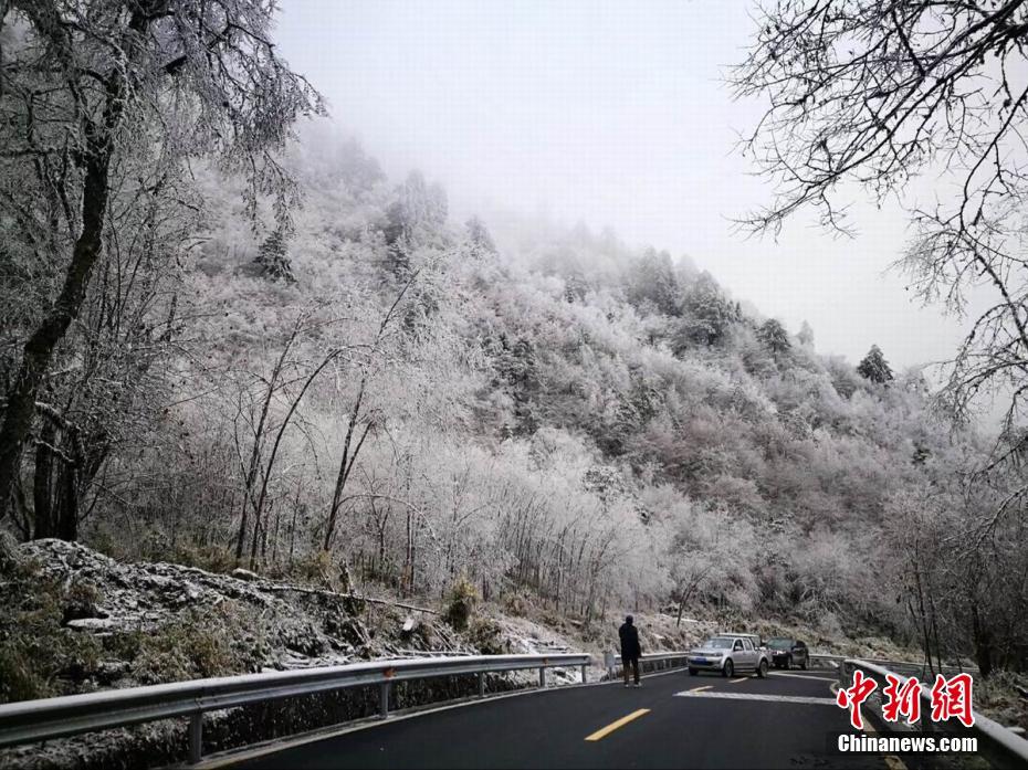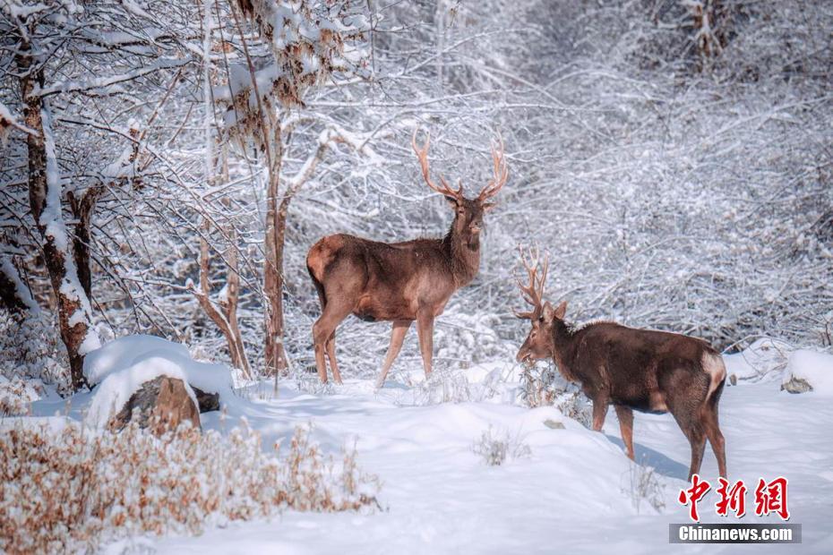 “红叶落下,白雪到来。”记者11月22日获悉,位于四川雅安市天全县的二郎山喇叭河景区已经迎来了今年的首场雪。洁白的雪花犹如一条弯曲的玉带,缠绕在群山间,晶莹剔透、银装素裹,景区中的野生鹿也结伴下山在雪中游玩。 喇叭河景区 供图