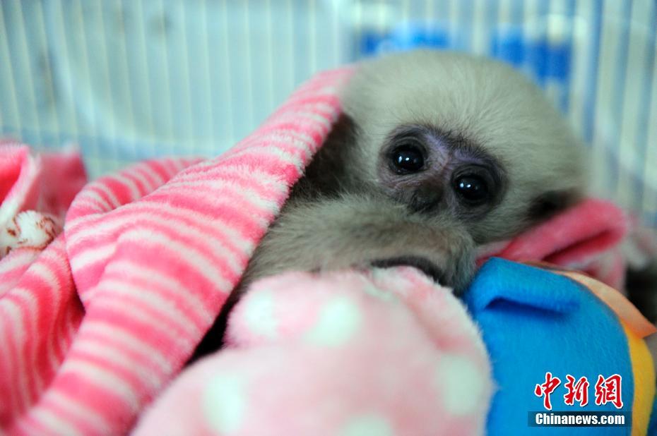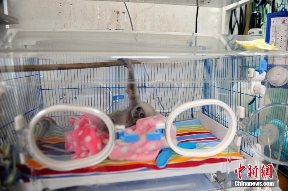 住在电子恒温育婴箱里的戴帽长臂猿宝宝,好动的本性难改。蒋雪林 摄