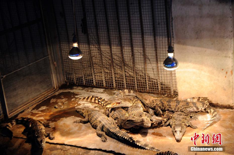 鳄鱼也怕冷,挤在保暖灯下御寒。蒋雪林 摄