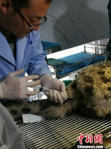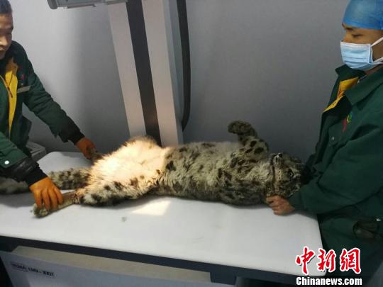 图为受伤雪豹接受救治。青海省野生动物救护繁育中心供图