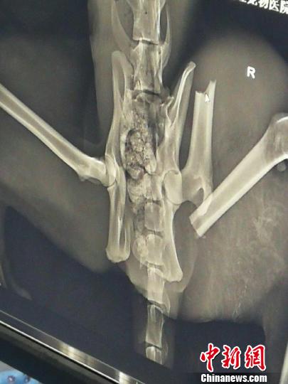 图为受伤雪豹X光片图显示,左后肢股骨骨折,髋骨左侧粉碎性骨折。青海省野生动物救护繁育中心供图