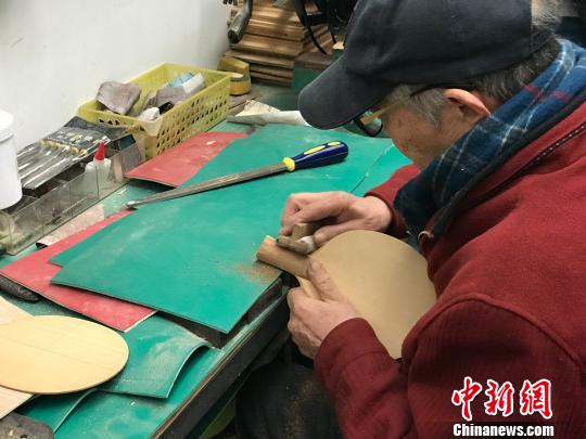图为曹立熹正在演示乒乓球拍的制作过程。岳依桐摄