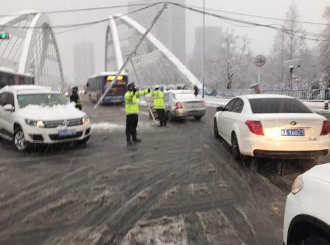 南京八大队交警在辖区高架上排堵,因为大雪缘故,很多车无法上坡,交警一辆一辆帮忙推上去。