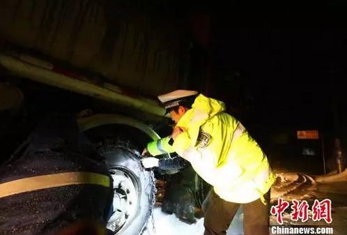 △湖北宜昌交警为货车安装防滑链条