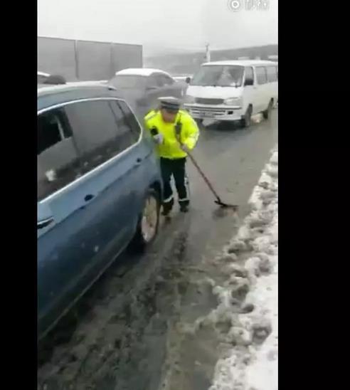 △湖北宜昌交警为过路车辆清除积雪