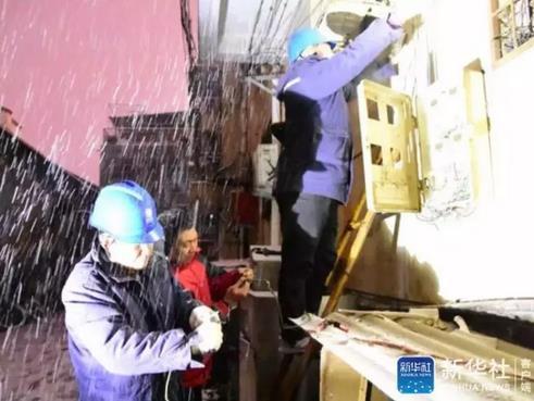 3日,在河南省西平县,巡线人员冒雪为群众更换老化线路,解决群众用电问题。