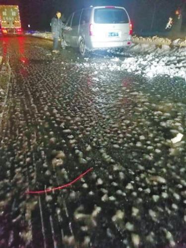 昨晚7点至10点,3个小时,记者一行仅向前行驶了15公里,而车也常因路面积雪较厚而出现轮胎打滑的情况,记者以及随同人员只能下来推车。昨晚10点15分,记者一行驾车被堵在距灵山站约2公里处,约半个小时仍一动不动,无奈只能下车步行,在排成长龙的大货车间穿行。步行至距灵山收费站1公里处,记者发现,该处是一个长约200米的斜坡,一辆长10多米的大货车,拉了一整车小汽车,开着双闪停在路上。司机下车拿着一根钢钎,在戳后车轮下的冰雪,但由于该车在原地打滑,导致后面的车无法通过。