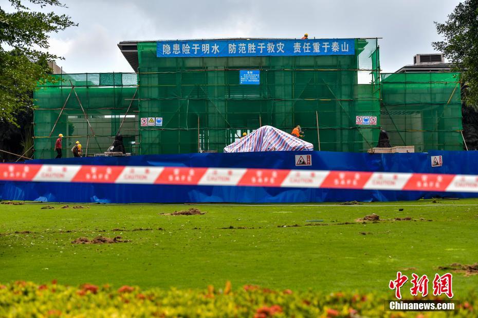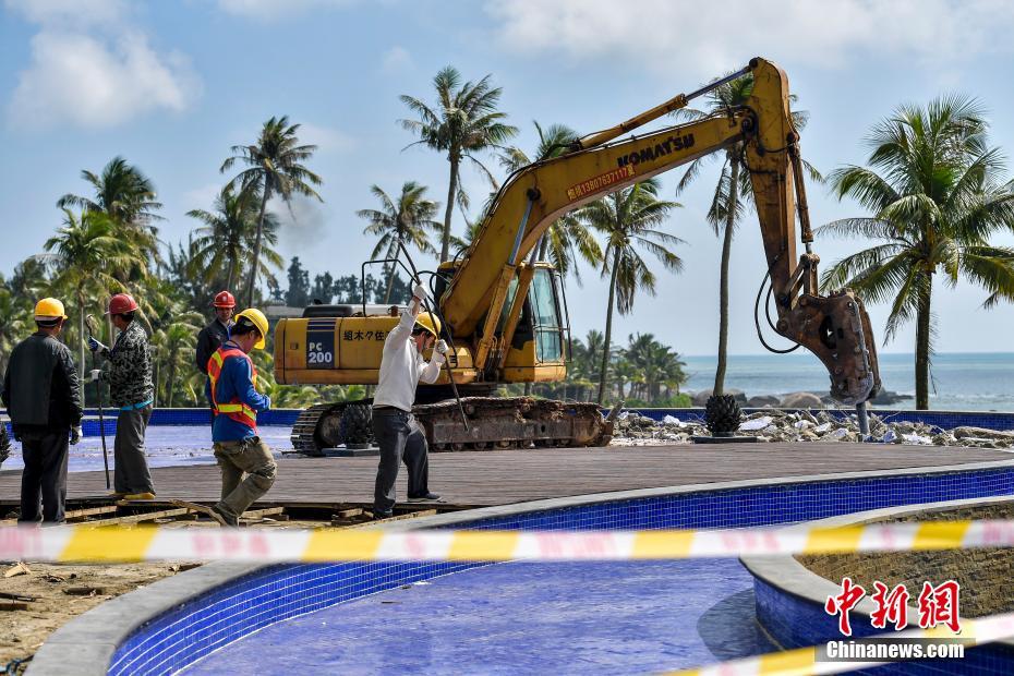 1月16日,工人正在进行施工围档作业,自行拆除位于文昌市龙楼镇鲁能山海天精品酒店项目,拆除后将进行生态恢复。据了解,鲁能山海天精品酒店、鲁能山海天展销中心位于海南省文昌市龙楼镇红海村委会,属海南铜鼓岭国家级自然保护区实验区范围内,两个项目的建设未取得规划许可和施工许可,未进行备案登记,存在未批先建的情况。中新社记者 骆云飞 摄