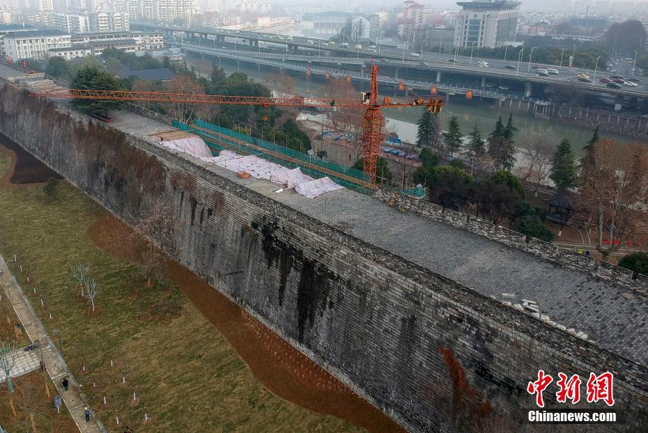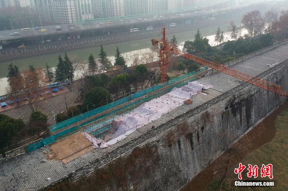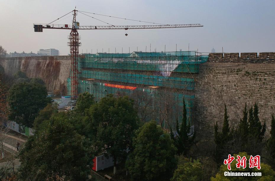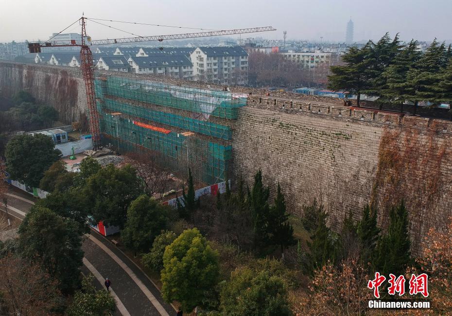 1月17日,航拍南京明城墙武定门南园段,施工脚架已经搭建完毕,工作人员正在维修。近日,南京市对明城墙武定门南园至逸景园小区范围内的部分鼓胀区城墙进行加固维修,“动手术”保健康。中新社记者 泱波 摄