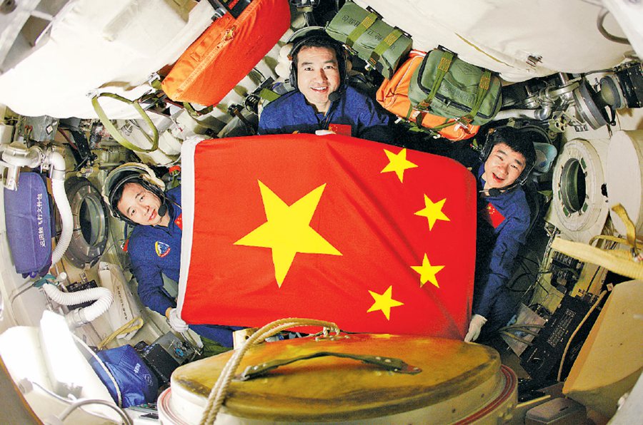 航天员翟志刚、刘伯明和景海鹏在飞船内展示五星红旗。 朱九通摄