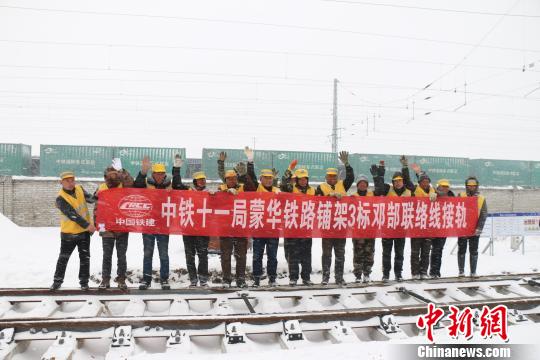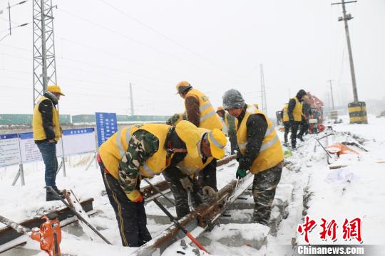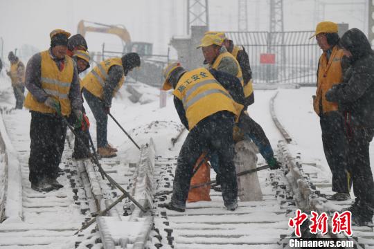 中新网武汉1月25日电 (曹丛奎 曾繁波 徐金波)25日,湖北省北部出现大面积降雪天气,为保障国家重大交通项目——蒙西至华中地区铁路煤运通道(简称“蒙华铁路”)工程进度,中铁十一局蒙华铁路铺架建设者顶风冒雪,在湖北襄阳境内实现蒙华铁路邓郜联络线与焦柳铁路成功对接。