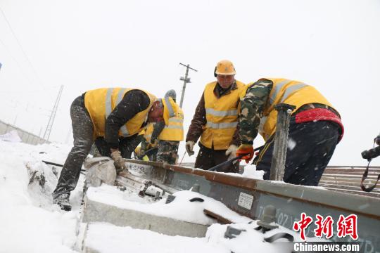 图为,建设者顶风冒雪进行线路铺架施工 曾繁波 摄