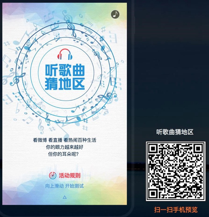 这支H5是各地脍炙人口民歌的合集,用户通过听民歌来竞猜这曲民歌属于的地区,最后,根据用户的答题情况,系统会给出分数,非常具有参与性和挑战性。