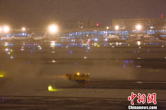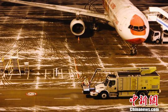 26日清晨,各航空公司开始对飞机进行除冰雪作业,确保航班安全运行。殷立勤 摄