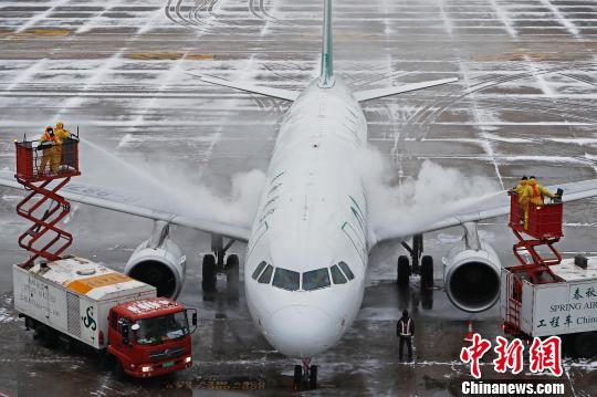 26日,春秋航空工作人员正在对飞机进行除冰雪作业。殷立勤 摄