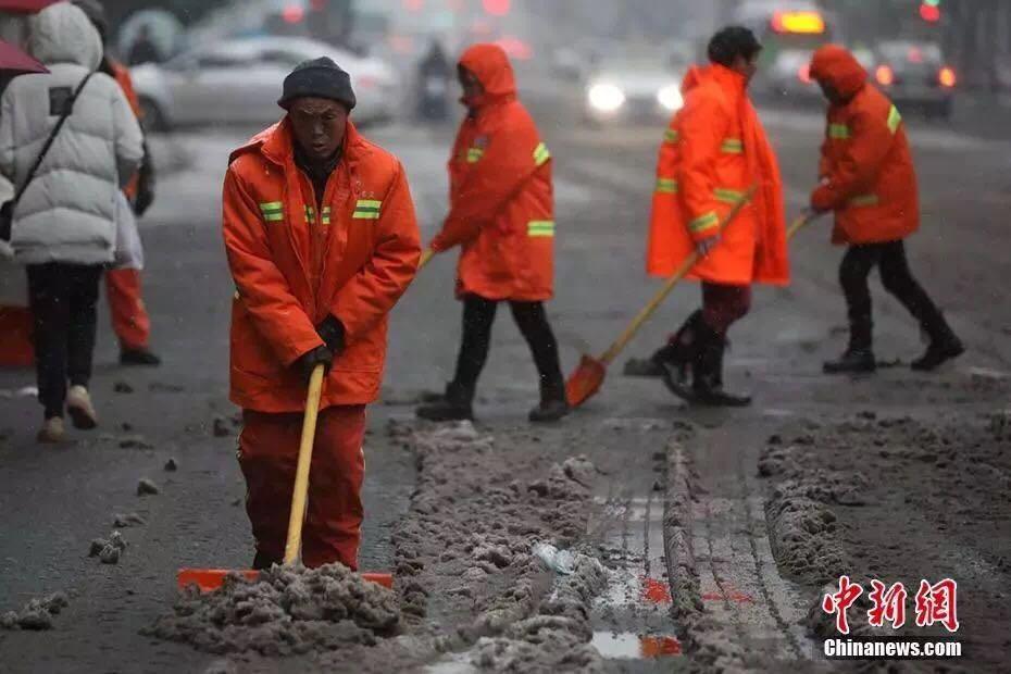 △孩子看到环卫工人扫雪时,从兜里拿出大白兔奶糖,送给环卫工人们