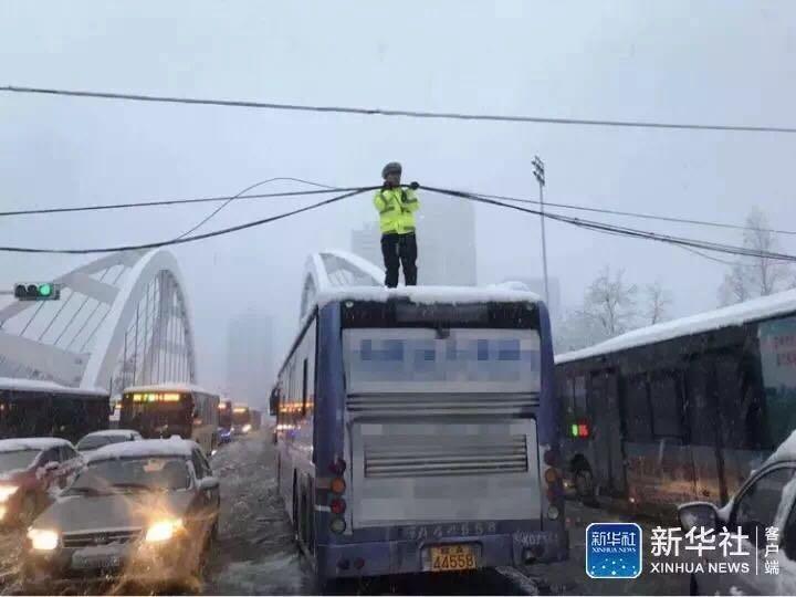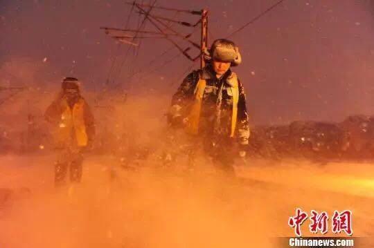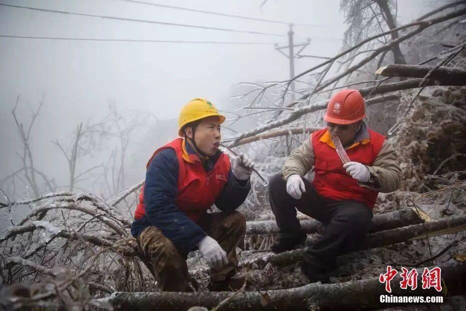 △保障输电设备安全运营,检修员冒着大雪爬上铁塔,边敲冰,边安装融冰短接线