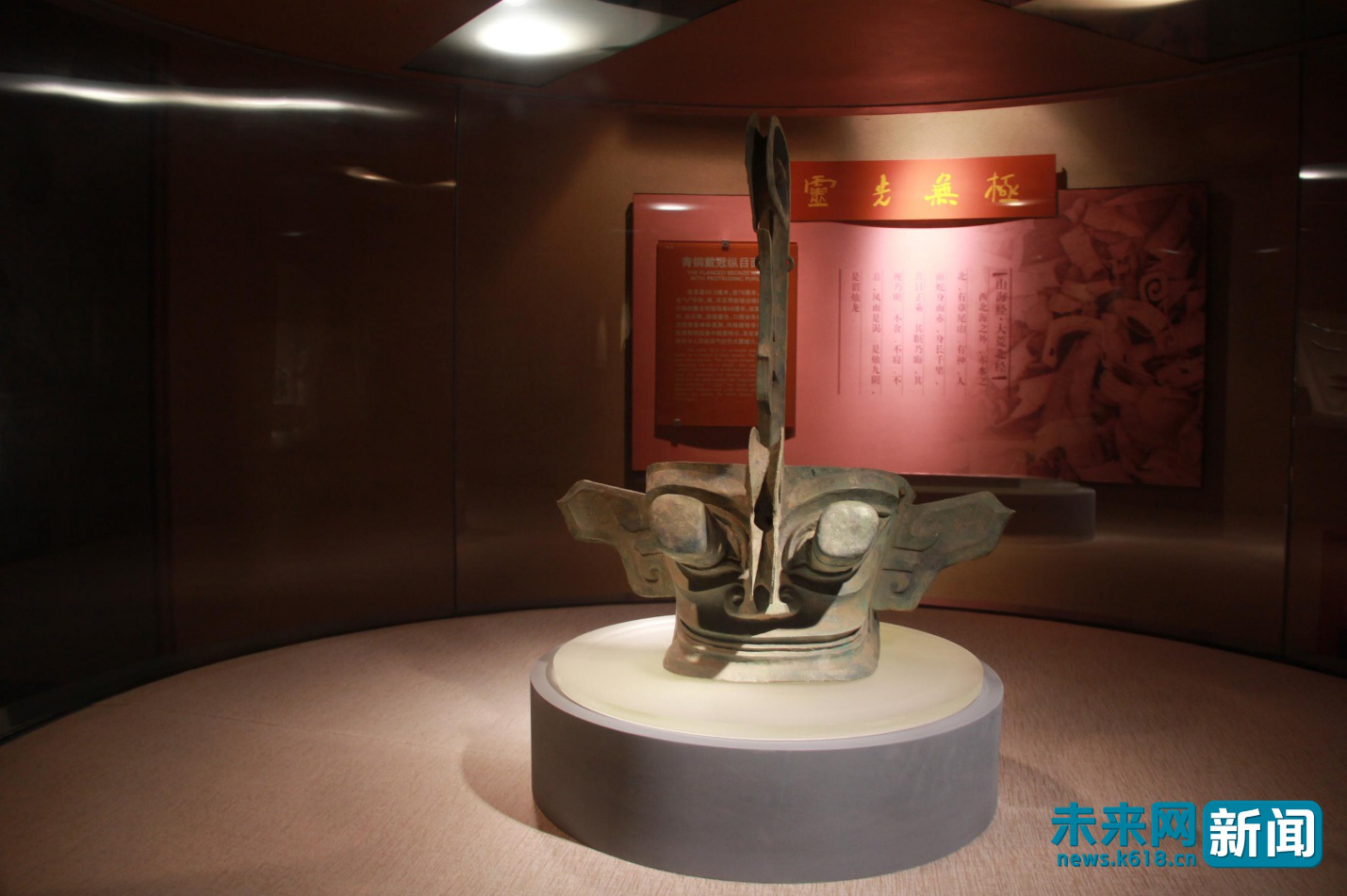 三星堆博物馆陈列的青铜面具。(未来网记者 廖瑾 摄)