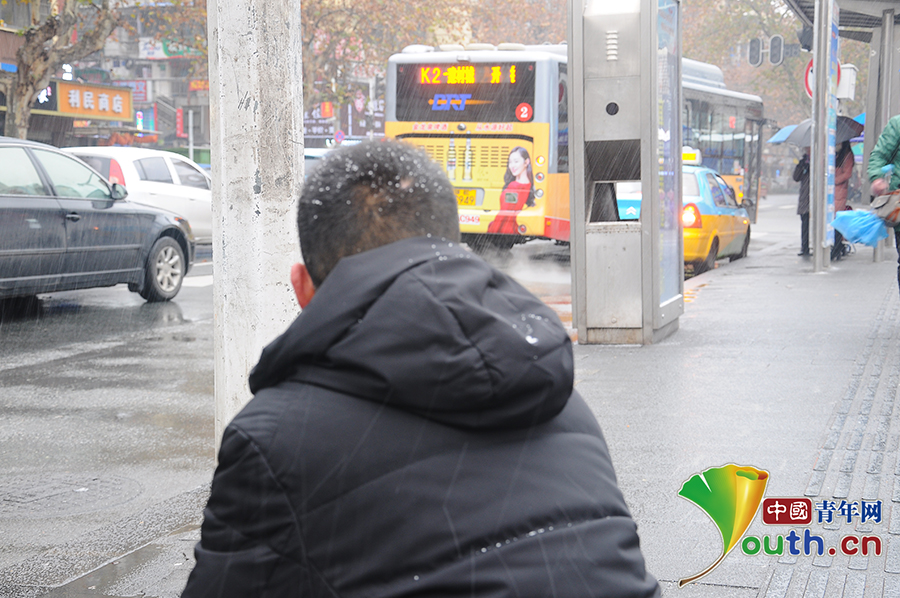 雨雪中,刘作彪乔装在公交站点观察上下车情况。中国青年网通讯员熊波摄