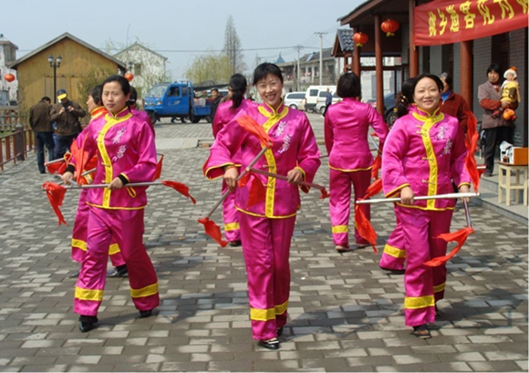 打莲湘是当地的一种舞蹈。来自甪直淞南村六组的金根英换上服装,英姿飒爽,她告诉记者,打莲湘,大都要8到10个人,再少就不好看了,打莲湘的服装都是自己做的。甪直打莲湘进过北京,还是世界非物质文化遗产呢。