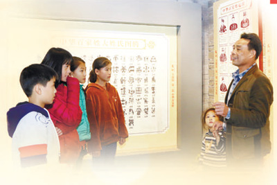 2月12日,海口市美富村村民王传代(右)给村里的孩子们讲述百家姓起源。本报记者 黄晓慧摄