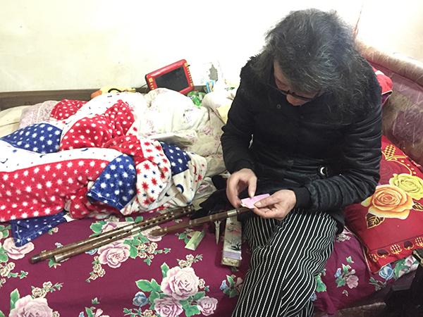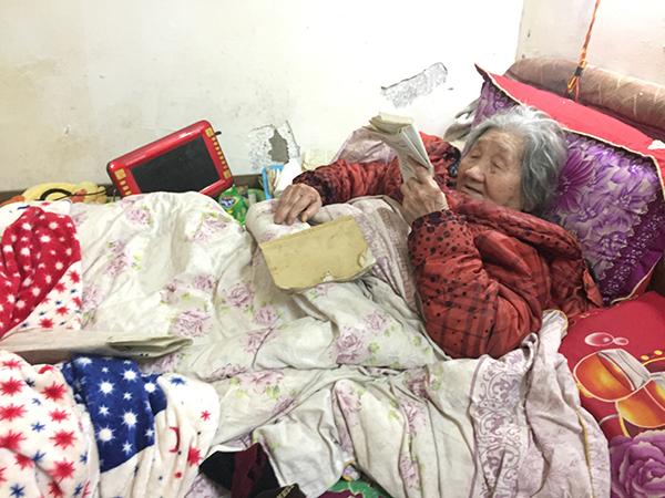 88岁的尹佩君视力很好,能看清民间小调的曲词。由于记忆力差,几个小时前的事都无法记起,尹佩君只能和外人做简单交流,她无法记得去世20年的女儿,用手指朱孟勋,笑着说,“我只知道这一个女儿”。