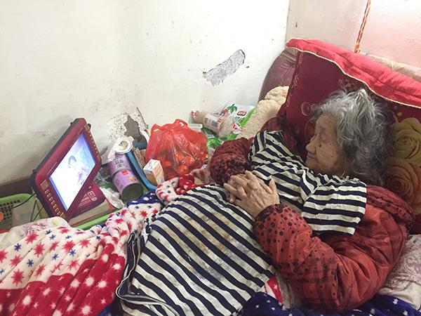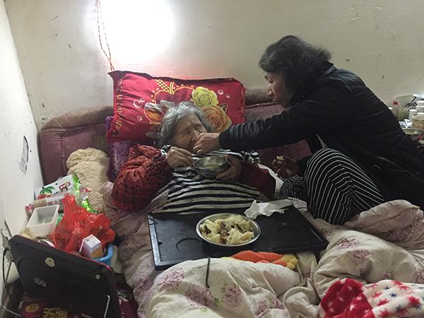母亲生活不能自理,吃饭也需朱孟勋帮忙。房间脏乱,唯一的女主人躺在床上,她是朱孟勋的母亲尹佩君,今年已经88岁。8年前,尹佩君左腿踩空骨裂,自此无法站立,大小便没法自理,照料老人重担落在了儿子朱孟勋身上。