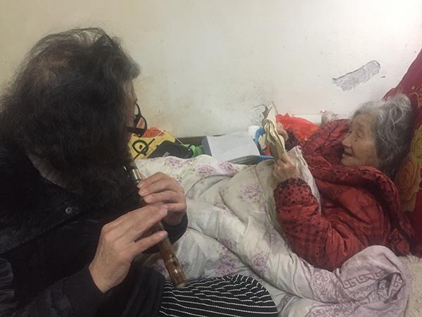 去年,桂林市大力推进创建全国文明城市行动,朱孟勋不再上街吹笛。留守狭窄的出租房内,朱孟勋会打开音响,吹起笛,拉起二胡,躺在床上的尹佩君借着灯光,看手中的民间小调曲词,跟着音乐节奏哼唱起来。