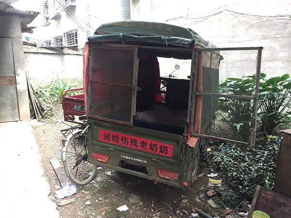 三轮车放在家门口,车内放着被子,车尾贴着七个字:“送给伤残老奶奶”。