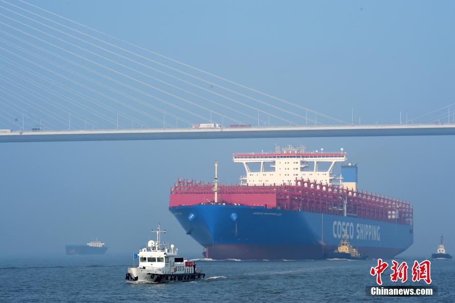 3月27日上午,在江苏南通、常熟、太仓三地海事部门协作和海巡艇的维护下,由中远海运重工旗下南通中远海运川崎船舶工程有限公司建造的20000标准箱级集装箱船“COSCOSHIPPINGLEO”轮(中文名为“中远海运狮子座”轮)从中远川崎2号泊位出江试航。文/王锴梁 倪冲 图/陈福广
