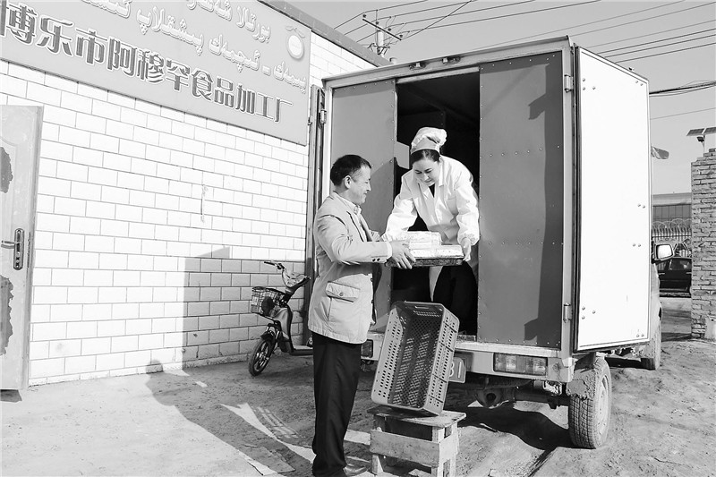 烘焙坊慢慢走上了正轨。为了提高知名度、扩大销量,库尔班江骑着三轮车走遍了博乐市区和乡镇的商店,起初以寄卖的方式推销,卖完了再去收钱,后来订单越来越多,送完货当天就能结账。