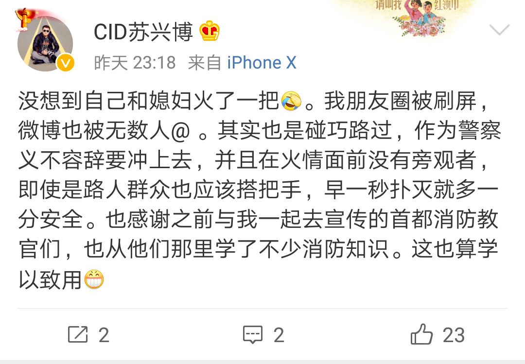 事后,苏兴博发微博表示,“作为警察义不容辞要冲上去”。