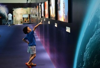 2017年7月26日“中国梦·航天梦——首届中国航天员飞天摄影作品展”在京举行。在北京天文馆,一名小朋友在摄影展上参观。新华社记者王化娟摄