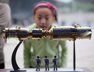 2014年5月17日,一名小朋友在南京科技馆广场参观天宫一号、神舟九号载人交会对接模型。当日,2014年全国科技活动周暨南京市第26届科普宣传周在南京科技馆拉开帷幕,众多小朋友随家长赶赴“科技大集”,学习科学知识。
