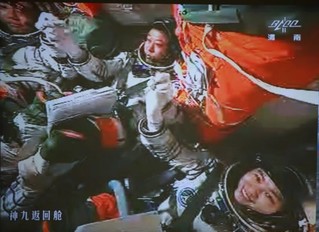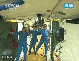 2012年6月18日,神九航天员景海鹏、刘旺、刘洋全部进入天宫一号实验舱内(视频截图)。新华社发