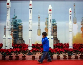 2013年11月9日,两名小参观者在观看长征系列运载火箭模型。