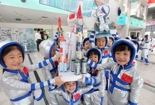 2011年9月29日,天津青少年活动中心的小学员在展示自制航天器模型。新华社发(刘东岳摄)