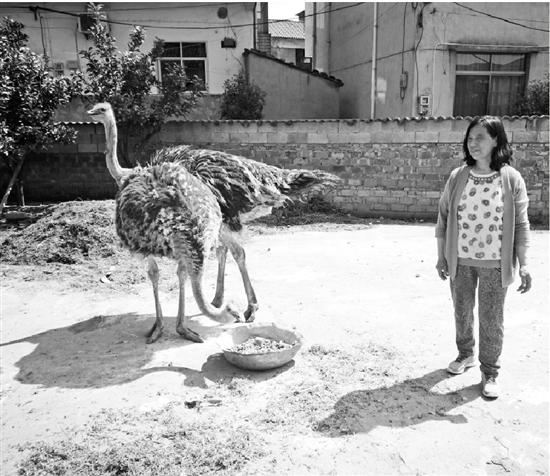 孔雀走了,鸵鸟成了吴素勤的“大宝贝”。但鸵鸟饭量极大,一只鸵鸟一顿要吃一脸盆食物。去年,吴素勤种的1000多斤红薯全部成了鸵鸟的腹中餐。