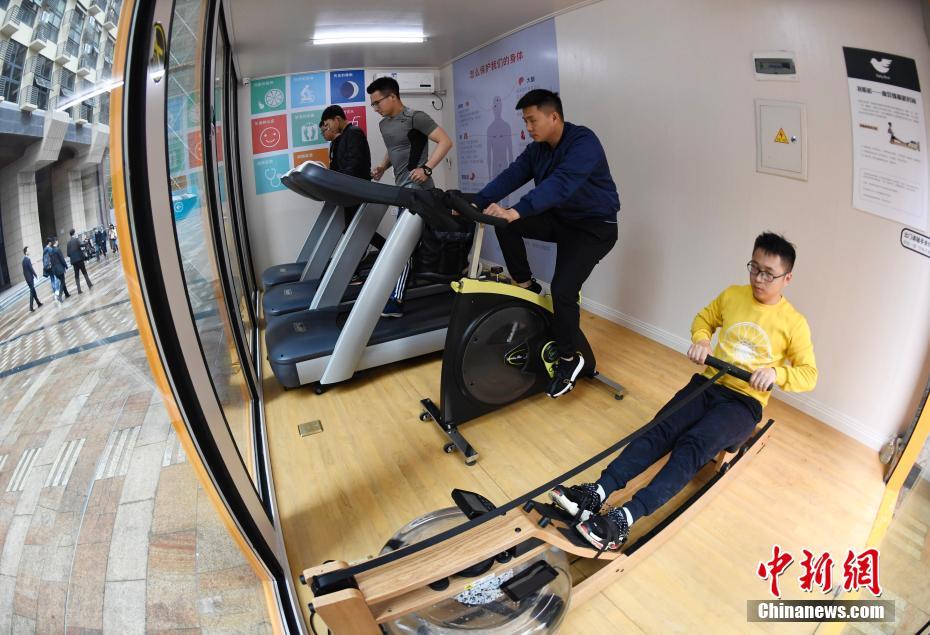 民众在自助健身“集装箱”内锻炼。中新社记者 安源 摄