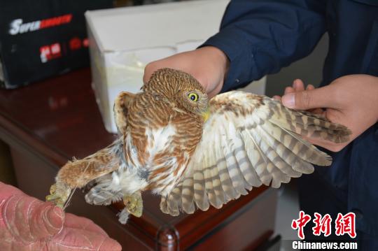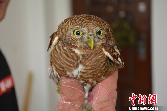 中新网红河4月11日电 (郭鑫 黑萍英 赵志平)记者11日从云南省红河州森林公安局获悉,其民警在红河州金平县一居民家中发现一只“黄眼萌鹰”,经鉴定是国家二级重点保护野生动物斑头鸺鹠,其生命体征良好,无外伤痕迹,民警随即将其放生。