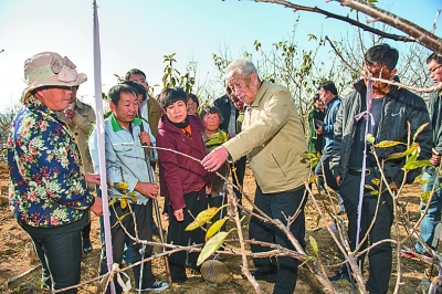 束怀瑞(右二)向农户传授果树种植技术。山东农业大学供图