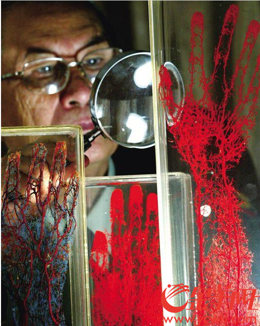 另外一种技术是南方医科大学人体科学馆里最有特色的一个技术,叫“管道铸型标本”。用溶解剂把塑料溶解成液体状态,然后像打针一样把液体注入到标本的管道里。等到溶剂挥发后,高分子化合物就会凝固,再用一些酸或碱溶液把人体组织腐蚀掉,留下来的就叫做管道铸型标本。