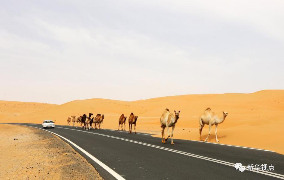 ↑2016年5月6日拍摄的阿联酋的利瓦沙漠公路上的驼队。 新华社记者 李震摄