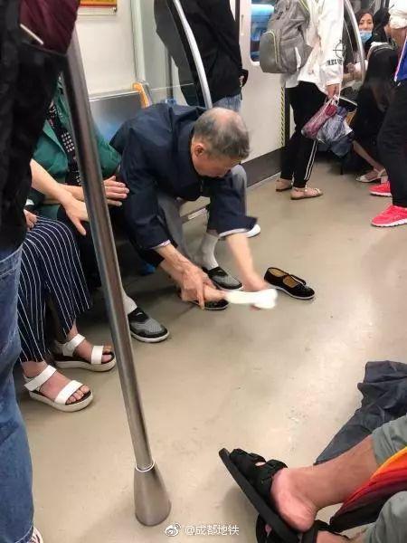 11日,成都下起了暴雨,地铁2号线上,老奶奶鞋子被雨淋湿,老爷爷将自己的干鞋袜脱下给她换上,自己则换穿已经湿透的女式布鞋。(图片来源:微博@成都地铁)