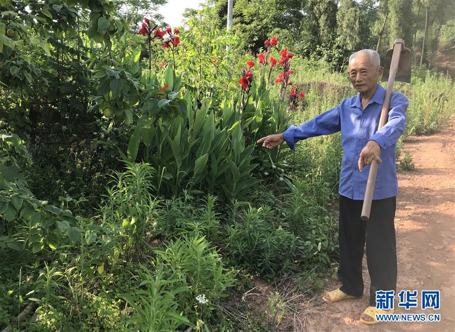 在重庆市潼南区花岩镇龙怀村,吴恒忠指着他亲手为儿子栽下的美人蕉(6月6日摄)。新华社记者周文冲摄