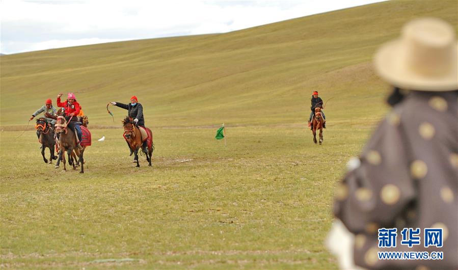 改则县改则镇日玛村骑手在草原上表演跑马(8月6日摄)。当日,西藏阿里地区改则县许多刚刚收获完羊绒的牧民相聚草原,赛马休闲,喜庆丰收。 新华社记者 张汝锋 摄