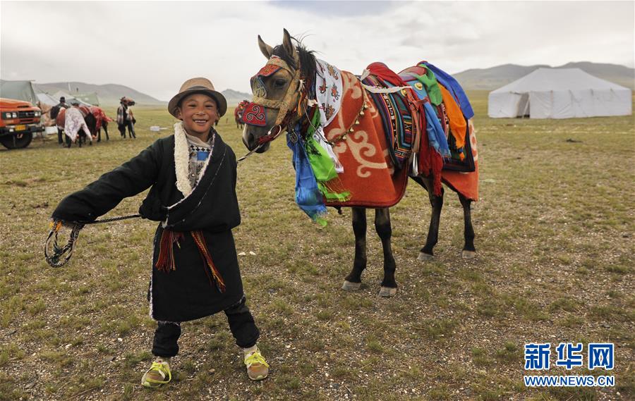 改则县改则镇日玛村一名少年牵马前行(8月6日摄)。当日,西藏阿里地区改则县许多刚刚收获完羊绒的牧民相聚草原,赛马休闲,喜庆丰收。 新华社发(蔡云锋 摄)