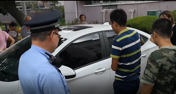 8月2日上午10时15分,监控画面显示,幼童被锁在一辆白色轿车后座,妈妈孙女士焦急地在旁观察车内情况。原来,孙女士是到山龙新村拜访朋友的,下车后关上车门,转身想将车上女儿抱出来时,却发现车门无法打开了。孙女士马上向警方报案,民警和消防官兵迅速赶到现场。